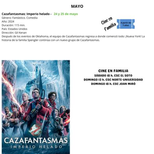 El programa "Cine en familia" está protagonizado esta semana por "Cazafantasmas: Imperio helado", que se podrá ver el sábado 24, a las 18:00 h, en el Centro Sociocultural El Soto y el domingo 25, a las 12:00 h en el Centro Sociocultural Norte-Universidad, y a las 18:00 h en el Centro Sociocultural Joan Miró.