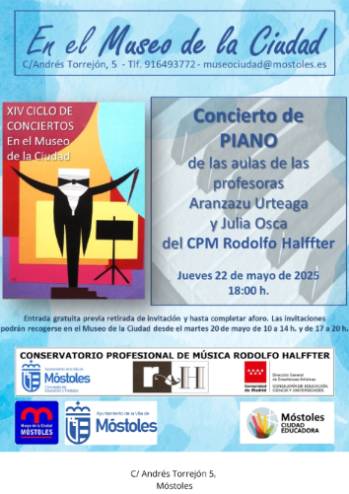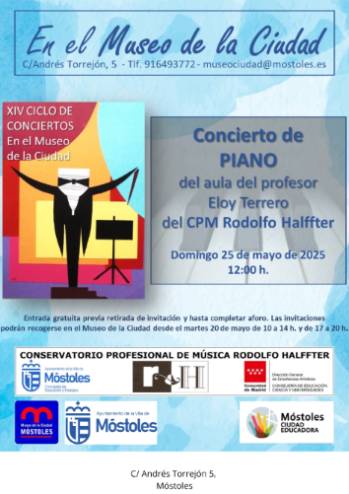 Dentro del XIV Ciclo de Conciertos en el Museo de la Ciudad, el domingo 25, a las 12:00 h, se ofrecerá el "Concierto de piano", del aula de Eloy Terrero, profesor del Conservatorio Profesional de Música Rodolfo Halffter.