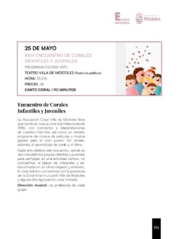 La Asociación Coral Villa de Móstoles organiza el domingo 25, a las 12:30 h, en el Teatro Villa de Móstoles el "XXVI Encuentro de Corales Infantiles y Juveniles", donde se dan cita distintos grupos infantiles y juveniles para participar en una actividad común, no competitiva: el placer de interpretar y ser escuchados en un clima relajado y amistoso. En la presente edición contaremos con la presencia de la Coral Infantil-Juvenil Villa de Móstoles y alguna otra agrupación coral invitada.