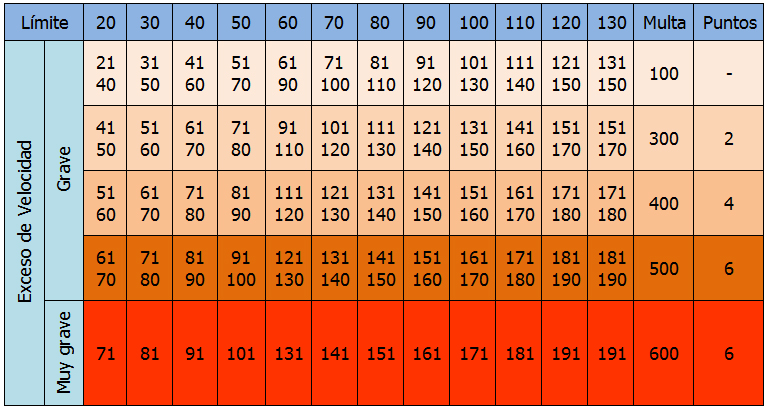 Cuadro de infracciones y sanciones por exceso de velocidad